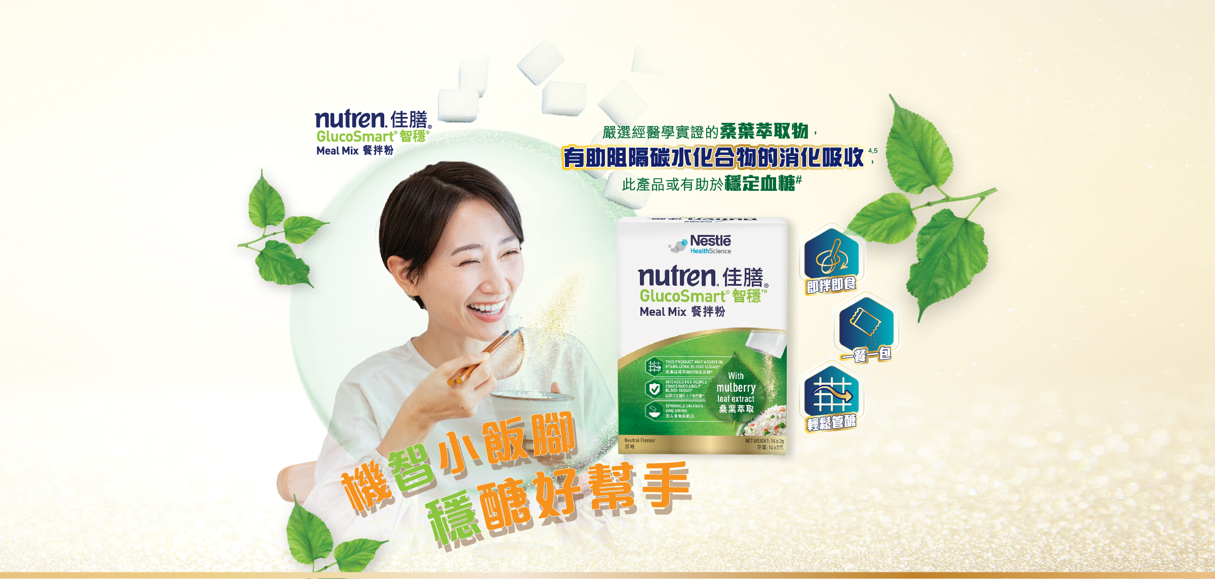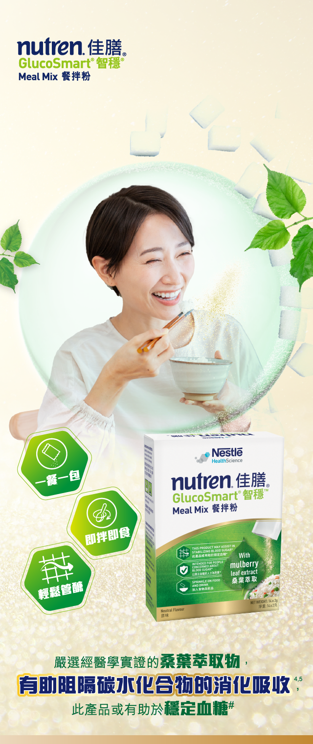 佳膳®智穩®餐拌粉含有桑葉萃取物,只需加入到食物中,即可在用餐時享受它的天然好處。佳膳®智穩®餐拌粉也含有膳食纖維、鉻及維他命D,揉合傳統及現代健康智慧,為關注血糖水平人士而設#。